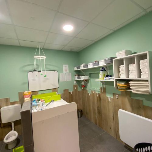 La salle de change est équipée d’un plan de change pour un accompagnement personnalisé, avec deux petits toilettes pour les plus grands, séparées par une cloison pour les aider à comprendre l’importance de l’intimité.